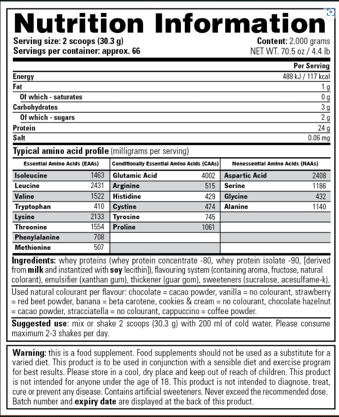 100% Whey is the showcase product of Stacker2 Europe’s sports nutrition line. 24 grams of protein in 30 grams of powder create a protein percentage of almost 80%, and this protein percentage is entirely made up of whey. 100% Whey is the best protein with the highest biological value. Both professional athletes and regular users are full of praise for our 100% Whey product quality. Finally, there’s a protein shake on the market that dissolves completely, tastes great when mixed with water and contains no added sugar nor aspartame.